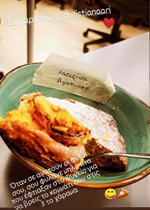 "Όταν σε αγαπούν οι φίλοι σου, σου φυλάνε μηλόπιτα που έφτιαξαν στο ψυγείο για να βρεις το κομμάτι σου στις 3 το χάραμα" έγραψε η Κατερίνα ευχαριστώντας την Χριστιάνα Αριστοτέλους που έφτιαξε μηλόπιτα και της άφησε ένα μεγάλο κομμάτι στο ψυγείο. Δείτε τη φωτογραφία πιο κάτω: