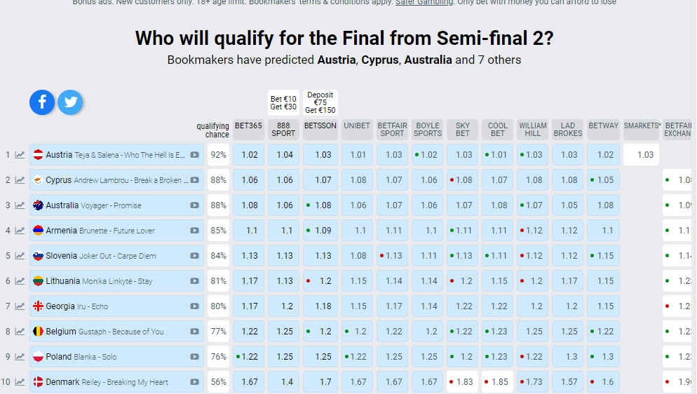 Σε αντίθεση με την Ελλάδα, η οποία θα είναι έκπληξη αν περάσει στον τελικό, μιας και βρίσκεται εκτός δεκάδας, στην 12η θέση για πρόκριση στον τελικό.