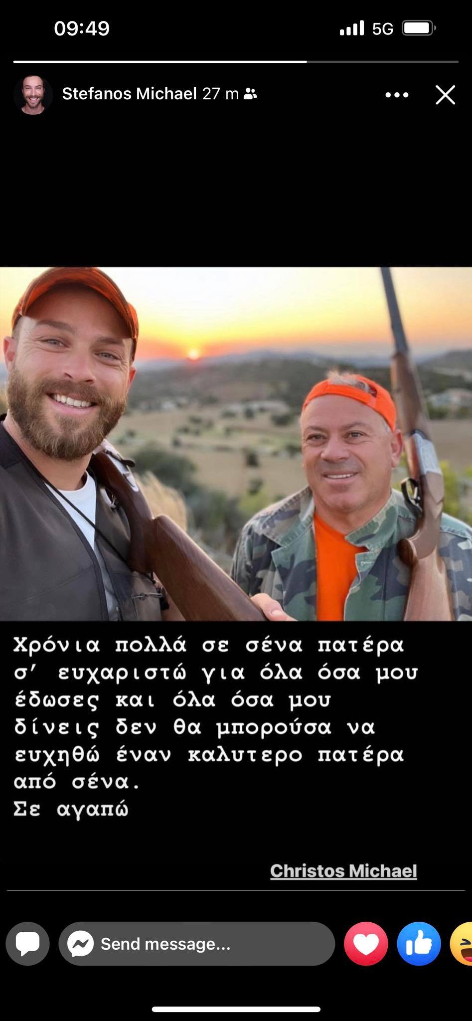 Ο Στέφανος Μιχαήλ, στην συγκεκριμένη εικόνα που δημοσίευσε στους διαδικτυακούς του φίλους, ποζάρει με τον εορτάζοντα πατέρα του, Χρίστο, και γράφει τα εξής: "Xρόνια πολλά σε εσένα πατέρα,σε ευχαριστώ για όλα όσα μου έδωσες και όλα όσα μου δίνεις.Δεν θα μπορούσα να ευχηθώ έναν καλύτερο πατέρα από εσένα.Σε αγαπώ". Δείτε την εικόνα πιο κάτω: