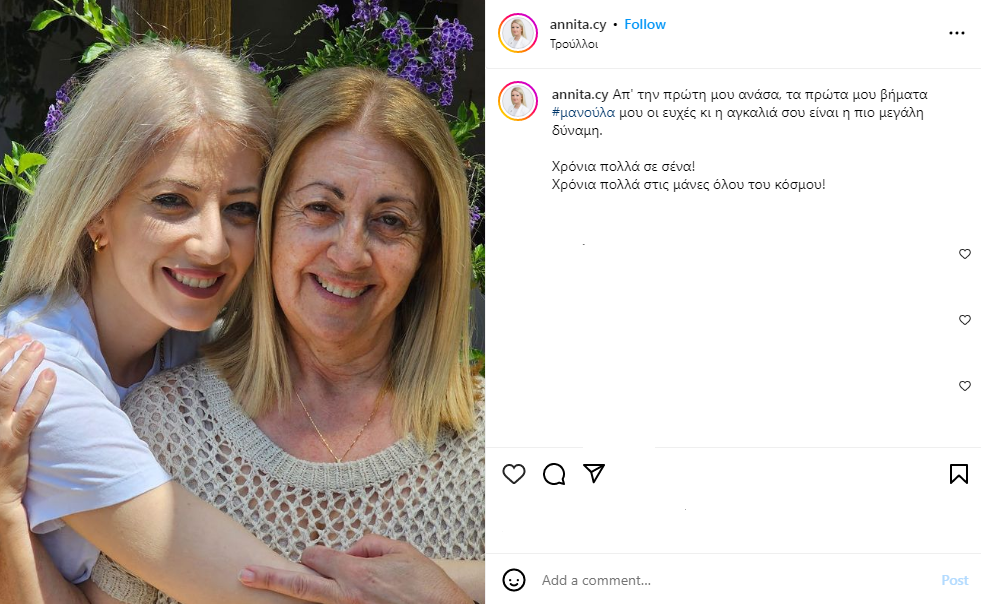 “Απ' την πρώτη μου ανάσα, τα πρώτα μου βήματα μανούλα μου οι ευχές κι η αγκαλιά σου είναι η πιο μεγάλη δύναμη. Χρόνια πολλά σε σένα! Χρόνια πολλά στις μάνες όλου του κόσμου!”, έγραψε η Αννίτα Δημητρίου στην ανάρτησή της. Δείτε πιο κάτω το σχετικό post: