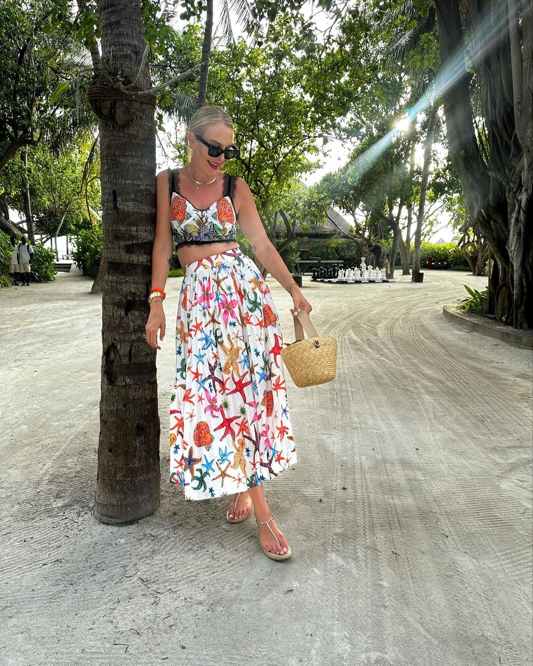Όπως μπορείτε να δείτε και εσείς από την εικόνα που μοιράστηκε στον προσωπικό της λογαριασμό στο Instagram η ίδια σε μία casual βραδινή έξοδό της επέλεξε ένα two pieces σύνολο με A-line φούστα και crop top με starfish print που ταίριαζε απόλυτα με το summery σκηνικό.