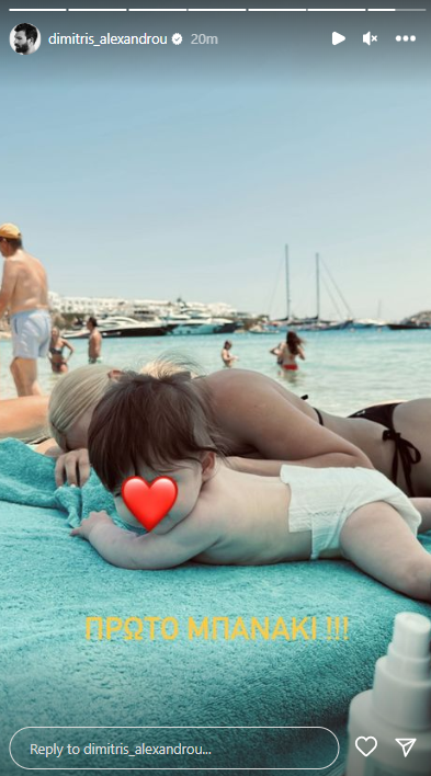 To γνωστό μοντέλο, συγκεκριμένα απαθανάτισε την Ιωάννα Τούνη με τον γιο τους να βρίσκονται ξαπλωμένοι στο κρεβατάκι της παραλίας, γράφοντας τα εξής στο story του: "Πρώτο μπανάκι". Δείτε την εικόνα πιο κάτω: