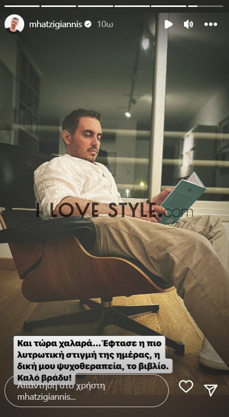 Σε αυτό βλέπουμε τον τραγουδιστή να μας καληνυχτίζει πιθανόν στο σπίτι του, παρέα με το βιβλίο του, σχολιάζοντας τα ακόλουθα: "Και τώρα χαλαρά.Έφτασε η πιο λυτρωτική στιγμή της ημέρας, η δική μου ψυχοθεραπεία, το βιβλίο". Δείτε την εικόνα πιο κάτω: