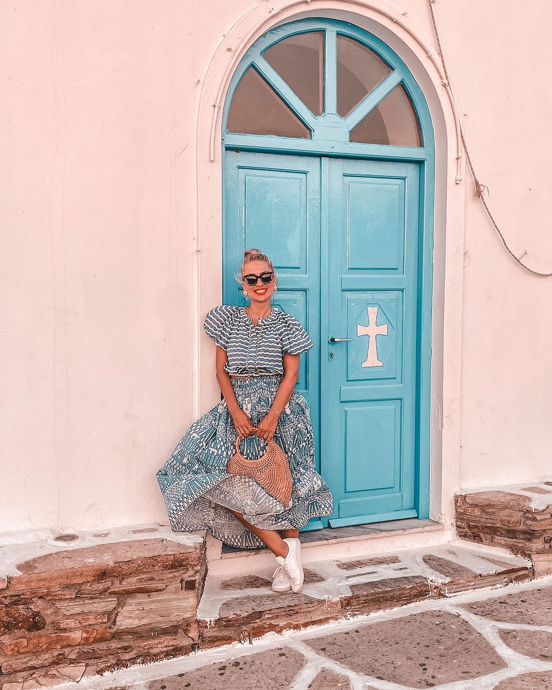 Η ίδια για αυτή την ιδιαίτερη στιγμή επέλεξε δημιουργίες της Κύπριας σχεδιάστριας Λεβίνιας Κονυαλιάν, από την καλοκαιρινή συλλογή της για το 2023 και συγκεκριμένα μία φουστά με print εμπνευσμένο από το μινιμαλισμό των Κυκλάδων και top σε striped σχέδιο σε μπλε και λευκό και puff μανίκια.