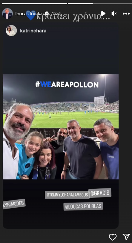 Ο Κύπριος Ευρωβουλευτής βρέθηκε στο στάδιο ΓΣΠ, προκειμένου να υποστηρίξει την ομάδα του, και στην παρέα του, πετύχαμε να βρίσκεται η Κύπρια παρουσίαστρια, Κατερίνα Χαραλάμπους, η οποία ανήρτησε σχετικό story στον λογαριασμό της στο instagram.