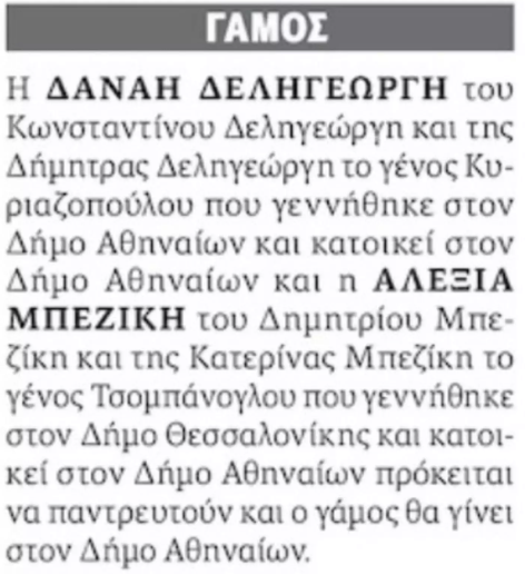 Η αναγγελία για τον γάμο των δυο γυναικών δημοσιεύθηκε στην "Εφημερίδα των Συντακτών". Πρόκειται για την ηθοποιό Αλεξία Μπεζίκη και τη σύντροφό της Δανάη Δεληγεώργη, η οποία είναι ψυχοπαιδαγωγός. Όπως αναφέρεται στην αναγγελία του γάμου τους, η τελετή θα γίνει στο Δημαρχείο της Αθήνας.