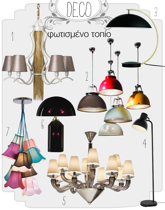 1. Φωτιστικό οροφής, Home & Deco / 2. Φωτιστικό οροφής Titan, Roche Bobois / 3. Επιτραπέζιο φωτιστικό, BoConcept / 4. Φωτιστικό δαπέδου, ΙΚΕΑ / 5. Πολυέλαιος Ottavia του οίκου Fendi Casa, PKS / 6. Επιτραπέζιο φωτιστικό Attolo, Rooms / 7. Φωτιστικό οροφής, Kare