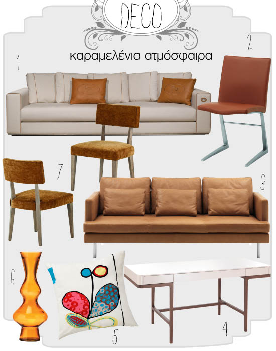 1. Καναπές Longchamp της Fendi Casa, PKS / 2. Καρέκλα Mariposa, BoConcept / 3. Καναπές Istra, BoConcept / 4. Τραπέζι Victor της Lema, Rooms / 5. Μαξιλαράκι, ΙΚΕΑ / 6. Βάζο Bolette, ID Design Xinaris / 7. Καρέκλες Berteille, Roche Bobois