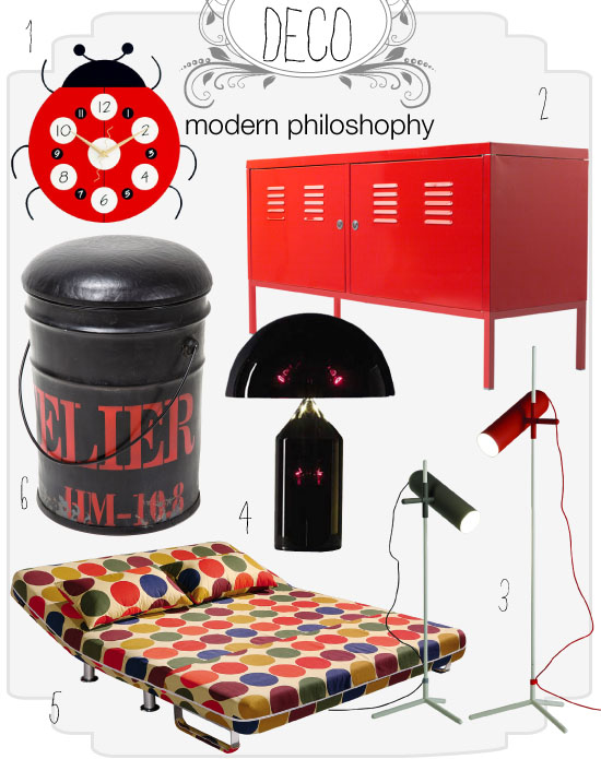 1. Ρολόι τοίχου, Casa di Gusto / 2. Μεταλλικό ερμαράκι φύλαξης, ΙΚΕΑ / 3. Φωτιστικά δαπέδου, Roche Bobois / 4. Επιτραπέζιο φωτιστικό, Rooms / 5. Καναπές-κρεβάτι Naso, Casa di Gusto / 6. Μεταλλικό πουφ με δερμάτινο κάθισμα, Kare