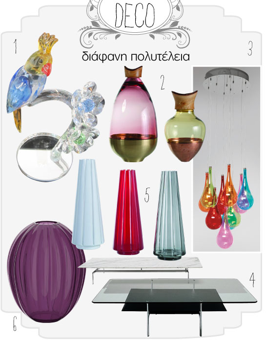 1. Κρυστάλλινο διακοσμητικό, Casa di Gusto / 2. Βάζα India, Roche Bobois / 3. Φωτιστικό οροφής, Kare / 4. Σετ τραπεζιών, Rooms / 5. Βάζα Candy, Roche Bobois / 6. Διακοσμητικό βάζο,ΙΚΕΑ