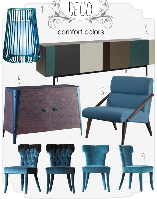 1. Φωτιστικό, Roche Bobois / 2. Μπουφές Rainbow, Rooms / 3. Πολυθρόνα Attesa, Rooms / 4. Βελούδινες καρέκλες Lavoro, Home & Deco / 5. Έπιπλο-ερμαράκι, Roche Bobois