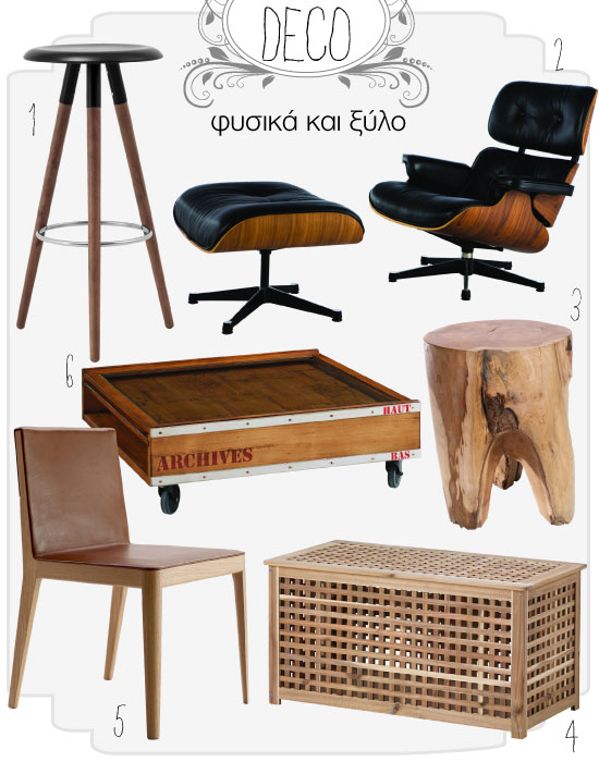 1. Stool, BoConcept / 2. Πολυθρόνα με υποπόδιο του οίκου Edimas, Livin / 3. Σκαμπό από κορμό δέντρου, Kare / 4. Αποθηκευτικό έπιπλο, ΙΚΕΑ / 5. Καρέκλα της BB Italia, Rooms / 6. Τραπέζι με τροχούς, Roche Bobois