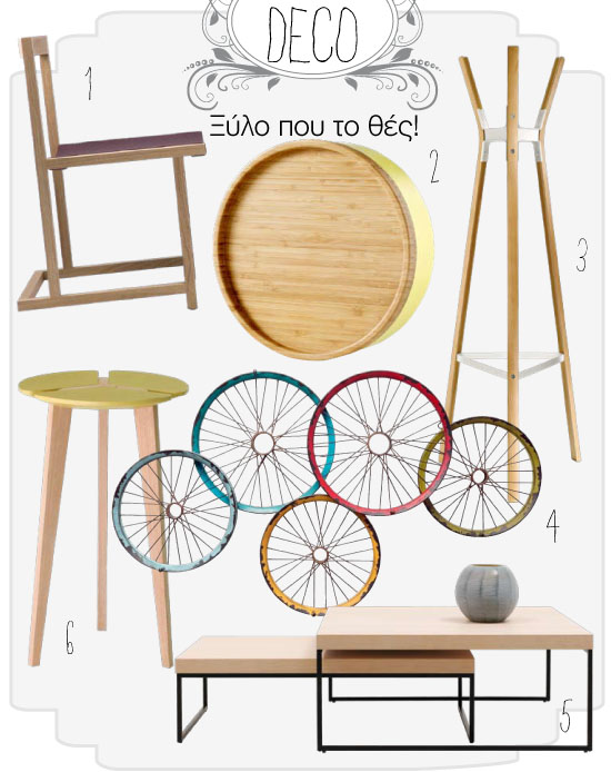 1. Καρέκλα, Rooms / 2. Δοχείο φύλαξης με ξύλινο πώμα, ΙΚΕΑ / 3. Καλόγηρος, Living / 4. Διακοσμητικό τοίχου, Kare / 5. Τραπεζάκι καθιστικού, BoConcept / 6. Τραπεζάκι, Roche Bobois