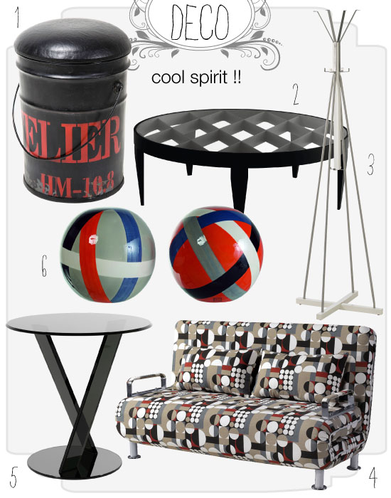 1. Σκαμπό με δερμάτινο κάθισμα, Kare / 2. Τραπεζάκι Rosalinda, Rooms / 3. Καλόγηρος, ΙΚΕΑ / 4. Καναπές Vera, Casa di Gusto / 5. Τραπεζάκι Mister, Home & Deco / 6. Διακοσμητικές μπάλες, Roche Bobois