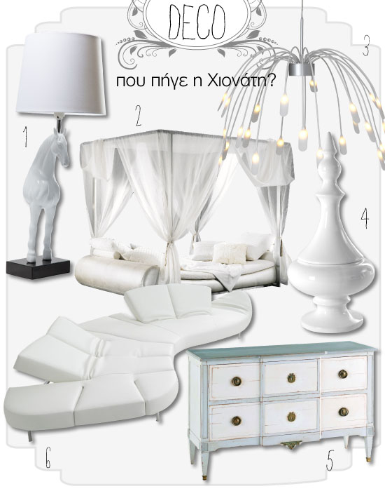1. Επιτραπέζιο φωτιστικό, Kare / 2. Κρεβάτι Intrigo, Home & Deco / 3. Φωτιστικό οροφής, ΙΚΕΑ / 4. Πορσελάνινο διακοσμητικό, Living / 5. Κομό, Roche Bobois / 6. Καναπές Flap, Rooms