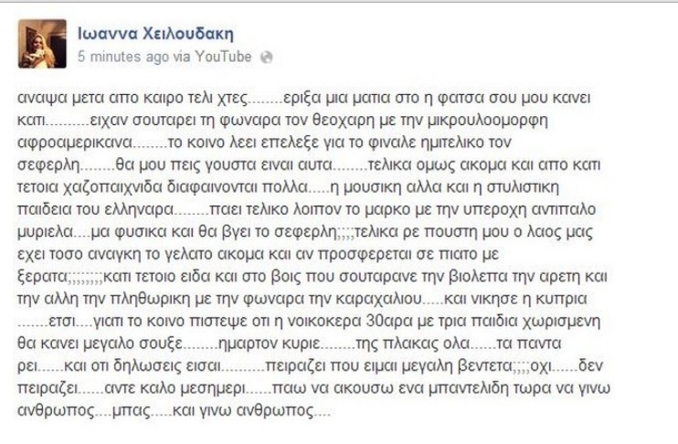 Με καθόλου κολακευτικά λόγια μίλησε η γνωστή τρανσέξουαλ, Iωάννα Χειλουδάκη για την γλυκύτατη Μαρία Έλενα αναφερόμενη στην μεγάλη νίκη της Κύπριας τραγουδίστριας στο "The Voice". Το status της στο facebook σχολιάστηκε πολύ αρνητικά απ' όλους καθώς η τοποθέτηση της ήταν εντελώς άκυρη.