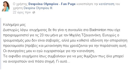 Την προγραμματισμένη συναυλία της στο Badminton στις 23 Ιουνίου με τον Μιχάλη Τζουγανάκη, αναγκάστηκε να ακυρώσει η Δέσποινα Ολυμπίου, εξαιτίας ατυχήματος. Οι πληροφορίες θέλουν την τραγουδίστρια να έπαθε διάστρεμμα στο πόδι πριν μερικές μέρες, με αποτέλεσμα όχι μόνο να ακυρώσει συναυλία της στο εξωτερικό αλλά και γενικότερα να μετακινείται με δυσκολία. Η ίδια έγραψε στον προσωπικό της λογαριασμό στο facebook: "Δυστυχώς λόγω ατυχήματος δε θα γίνει η συναυλία στο Badminton που είχε προγραμματιστεί για τις 23 του μήνα με τον Μιχάλη Τζουγανάκη. Ευτυχώς ο τραυματισμός μου δεν είναι σοβαρός, αλλά μου καθιστά αδύνατη την απαραίτητη προετοιμασία (πρόβες και μετακίνηση που χρειάζονται για την παράσταση αυτή). Οι συνεργάτες μου κι εγώ ευχαριστούμε για την κατανόηση. Τα αιφνίδια ατυχήματα ίσως συμβαίνουν για να μας θυμίζουν πως όλα μπορεί να ανατραπούν ανά πάσα στιγμή. Γι αυτό...".