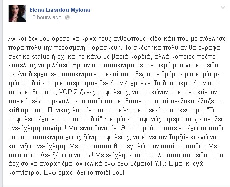 Ένα οργισμένο post στη σελίδα της στο facebook έγραψε η ηθοποιός Έλενα Λιασίδου μετά από ένα περιστατικό που της συνέβη την ώρα που οδηγούσε! Η ίδια όπως έγραψε χαρακτηριστικά δεν επιθυμεί να κατακρίνει κανένα ωστόσο ένιωσε μεγάλο θυμό μετά από αυτό το συμβάν που θέλησε να γράψει το πιο κάτω post. Δείτε τι έγραψε:
