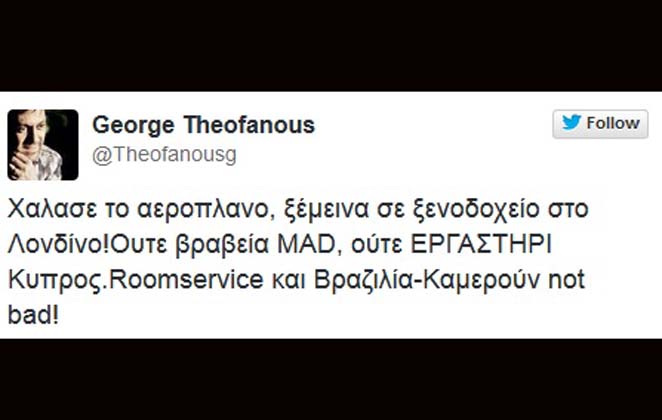 Φαίνεται πως η εβδομάδα του δεν ξεκίνησε καλά και είχε κάποιες μικρές ατυχίες! Τι εννοούμε; Ο Γιώργος Θεοφάνους δεν μπόρεσε να φτάσει στην Αθήνα, ώστε να βρεθεί στα φετινά βραβεία Mad Video Music Awards, μετά από βλάβη στο αεροπλάνου που θα τον μετέφερε από την Μεγάλη Βρετανία στην Ελλάδα. "Χάλασε το αεροπλάνο, ξέμεινα σε ξενοδοχείο στο Λονδίνο! Ούτε βραβεία MAD, ούτε ΕΡΓΑΣΤΗΡΙ Κύπρος. Room service και Βραζιλία-Καμερούν not bad!", έγραψε ο μουσικοσυνθέτης στο twitter του, με κάποιους να μιλούν για κακό μάτι.