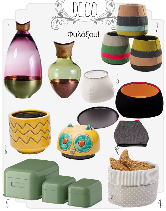 1. Βάζα India, Roche Bobois / 2. Διακοσμητικά με patchwork, Living / 3. Μοντέρνο έπιπλο, Rooms / 4. Θήκη ψωμιού, ID Design Xinaris / 5. Δοχεία φύλαξης, ΙΚΕΑ / 6. Κεραμικό διακοσμητικό, Kare
