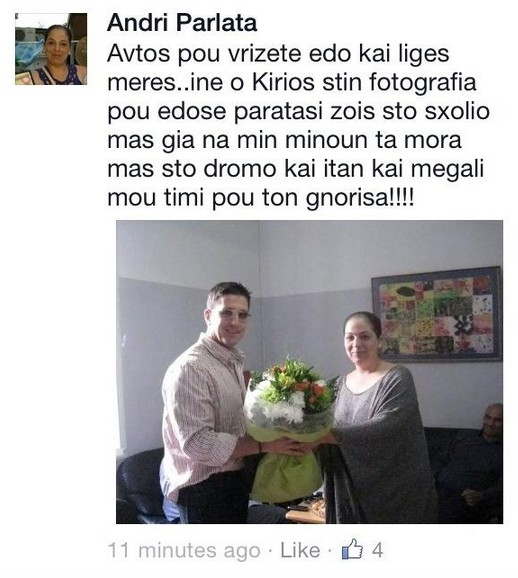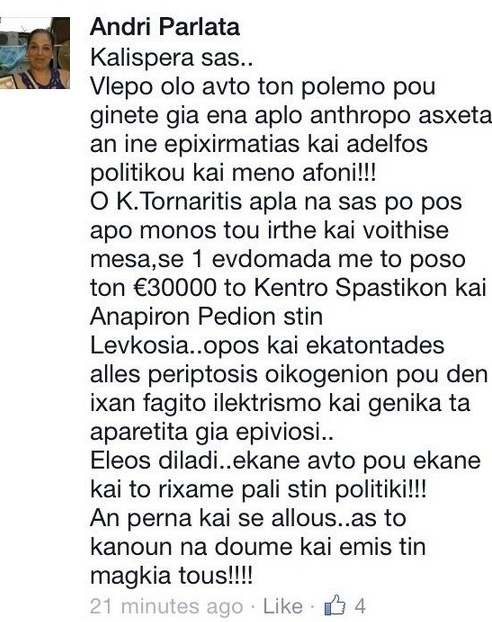 Μια συγκινητική ιστορία δημοσίευσε η Άντρη Παρλάτα, μητέρα ενός 6χρονου τετραπληγικού παιδιού με εγκεφαλική παράλυση το οποίο φοιτά στο Κέντρο Σπαστικών και Ανάπηρων Παιδιών "Ανεμώνη" στον Άγιο Ανδρέα Λευκωσίας. Όπως αναφέρει σε γραπτό σημείωμα της η κα. Παρλάτα πριν ένα χρόνο λόγω οικονομικών δυσκολιών το σχολείο πήγαινε για κλείσιμο και θα έμεναν 16 παιδιά με σοβαρές παθήσεις στα σπίτια τους. Τότε πήρε την πρωτοβουλία και χωρίς να τον ξέρει προσωπικά του έστειλε sms στο facebook. Εκείνος ανταποκρίθηκε αμέσως και αφού επισκέφθηκε το σχολείο σε μια βδομάδα τους έκανε εισφορά 30.000 ευρώ.