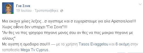 Την Παρασκευή η εκπομπή "Για σένα" κατέβασε ρολά για τις καλοκαιρινές τους διακοπές. Όπως ήταν φυσικό, η παρουσιάστρια από την έναρξη μέχρι το τέλος της εκπομπής ήταν φανερά συγκινημένη! Το αποκορύφωμα, όμως, ήταν την στιγμή που οι συνεργάτες της, της ετοίμασαν ένα βίντεο με τις ενάρξεις των εκπομπών τα τελευταία πέντε χρόνια αλλά και όταν της έφεραν μια τούρτα στο σχήμα του αριθμού πέντε (όσα και τα χρόνια που παρουσιάζει την εκπομπή). Μετά το τέλος της εκπομπής ανήρτησαν την πιο κάτω φωτογραφία στη σελίδα "Για Σένα" γράφοντας: "Μια εικόνα χίλιες λέξεις... σ’ αγαπάμε και σ’ ευχαριστούμε για όλα Αριστοτέλεια!!! Χωρίς εσένα δεν υπάρχει "Για σένα"!!! "Αν θες να πας γρήγορα πήγαινε μόνος σου, αν θες να πας μακριά πήγαινε με άλλους" Με αγάπη η ομαδάρα σου!!!".