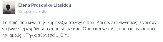 Στις δυο τα ξημερώματα η αγαπημένη μας ηθοποιός πόσταρε στο facebook τα πιο κάτω λόγια τα οποία είναι λόγια καρδιάς που βγαίνουν εντελώς φυσικά από μια μάνα για το παιδί της. Άλλωστε, η Έλενα Λιασίδου ξέρει πολύ καλά πως νιώθει η κάθε μάνα για το σπλάχνο της αφού και η ίδια είναι μητέρα του μικρού Αλέξανδρου που σε λίγες μέρες θα κλείσει τριών χρονών. Διαβάστε τι έγραψε: "Το παιδί σου είναι στην κυριολεξία σπλάχνο σου. Και όταν το γεννήσεις, είναι σαν να βγαίνει η καρδιά σου απ' το σώμα σου. Όπου και να πάει, όπου κι αν κτυπάει την ακούς... Την αισθάνεσαι... Ε.Λ.".