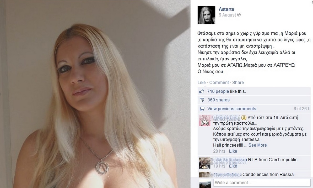 "Η Mαρία μας έφυγε από αυτόν τον κόσμο. Αφήνεις πολλά πίσω και πονάει όλη μου η ψυχή, είσαι το πιο ξεχωριστό πλάσμα, είσαι η Γυναίκα μου, θα σε λατρεύω εγώ, ο γιος μας και όλοι όσοι σε αγαπούν. Θα σε τιμώ πάντα και δεν θα ξεχαστείς πότε. Mέχρι να ξανά ανταμώσουμε αγάπη μου σε φιλώ μέσα από την ψυχή μου. Ο Νίκος σου και ο γιος σου Αντώνιος".