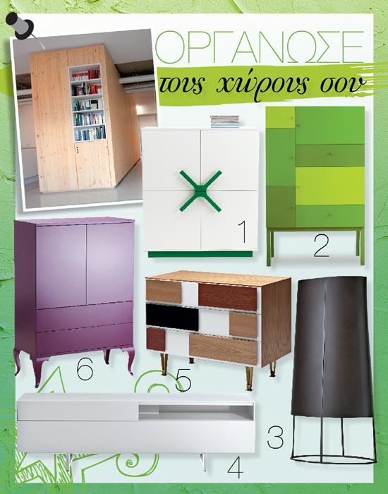1. Έπιπλο του Karim Rashid, ΒοCONCEPT / 2. Έπιπλο αποθήκευσης, ID DESIGN XINARIS / 3. Αποθηκευτικό έπιπλο Lancelot του οίκου De Castelli, HOME & DECO / 4. Μπουφές του οίκου Busnelli, ΗΟΜΕ & DECO / 5. Έπιπλο αποθήκευσης MOLTENI-VENERE GROUP / 6. Έπιπλο Trollsta, IKEA