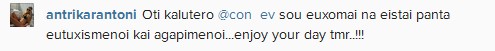 Με την σειρά της η Άντρη Καραντώνη ήθελε να της στείλει την δικιά της ευχή, έτσι έγραψε: "Ότι καλύτερο σου εύχομαι να είστε πάντα ευτυχισμένοι και αγαπημένοι… Απόλαυσε την μέρα σου αύριο!!!".