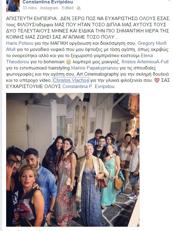 Με την πιο κάτω φωτογραφία φίλοι και συνεργάτες του ζευγαριού αποχαιρέτησαν την Μύκονο και μια αξεχάστη εμπειρία που είχαν. Σε αυτή μπορούμε να διακρίνουμε μεταξύ άλλων τους φωτογράφους Πάμπο Χαραλάμπους και Γιώργο Βασιλείου από τους Artcinematographers LP, το φωτογράφο Μάριο Παπακυπριανού, το Γιώργο Νικολάου της Aerial filming & photography Cyprus που ανέλαβε τις εναέριες λήψεις, τη μακιγιέζ Έλενα Θεοδώρου, το σχεδιαστή Gregory Morfi και τη wedding planner Χάρις Πότσου!