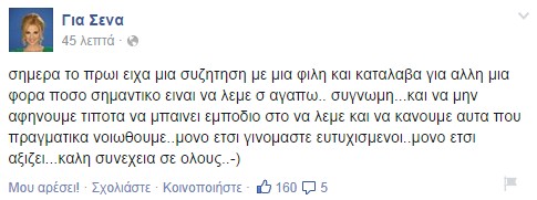 Μέρος της συζήτησης που είχε με μία φίλη της αποκάλυψε στους διαδικτυακούς της φίλους η Χριστιάνα Αριστοτέλους! Η ίδια είπε πως για άλλη μία φορά κατάλαβε πόσο σημαντικά είναι η συγνώμη και το σ’ αγαπώ και ότι τίποτα δεν πρέπει να μπαίνει εμπόδιο στην ευτυχία μας! Διαβάστε τι έγραψε ακριβώς στο facebook: