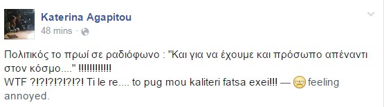Ενοχλημένη με τα λόγια γνωστού πολιτικού του νησιού μας ήταν η Κύπρια παρουσιάστρια πρωί-πρωί της Τρίτης. Όταν τον άκουσε να λέει την ατάκα "Και για να έχουμε και πρόσωπο απέναντι στον κόσμο...." η ίδια αντέδρασε αναρτώντας στο facebook την ατάκα του και προσθέτοντας "WTF ?!?!?!?!?!?! Ti le re.... to pug mou kaliteri fatsa exei!!!" τονίζοντας πόσο ενοχλημένη είναι!
