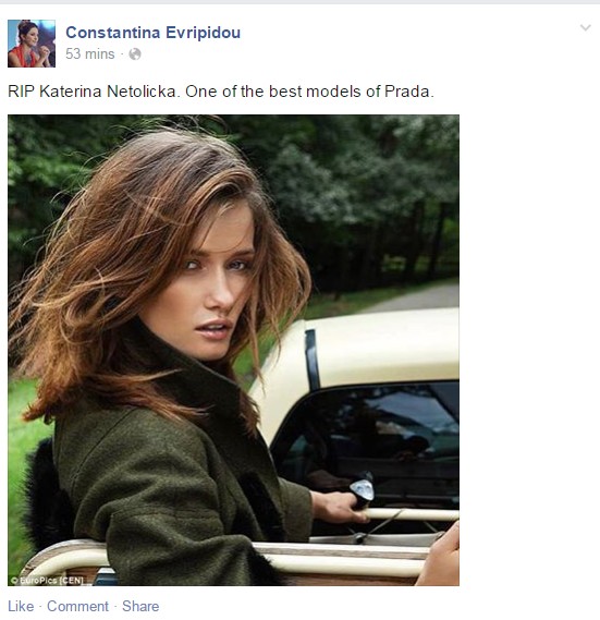 Σοκ έχει προκαλέσει στον κόσμο της μόδας –και όχι μόνο-, ο θάνατος κορυφαίου μοντέλου από την Τσεχία. Ο λόγος για την 26χρονη Κατερίνα Νετόλικα, η οποία ήταν το πρόσωπο σε καμπάνιες της Prada και της Loreal και η οποία βρέθηκε νεκρή στην μπανιέρα του σπιτιού της από τον αδερφό της. Δίπλα της, επίσης νεκρά, ήταν τα δυο κατοικίδια σκυλιά της. H Kωνσταντίνα Ευριπίδου πόσταρε την φωτογραφία του μοντέλου γράφοντας RIP και αναφέροντας πως ήταν ένα απο τα καλύτερα μοντέλα της Prada.