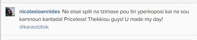 Φίλοι του όμως και συνεργάτες του ήθελαν να του πουν τα περαστικά με ένα ιδιαίτερο τρόπο! Όπως αποκάλυψς ο ίδιος βρέθηκαν κάτω από το μπαλκόνι του και του έκαναν καντάδα! Μάλιστα ανέβασε και μια φωτογραφία - "ντοκουμέντο" στον προσωπικό του λογαριασμό στο instagram!