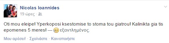 Στο σπίτι και στο κρεβάτι του πόνου είναι ο Νικόλας Ιωαννίδης, καθώς οι πολλές επαγγελματικές υποχρεώσεις του τον οδήγησαν στο νοσοκομείο και η διάγνωση του γιατρού έδειξε υπερκόπωση!