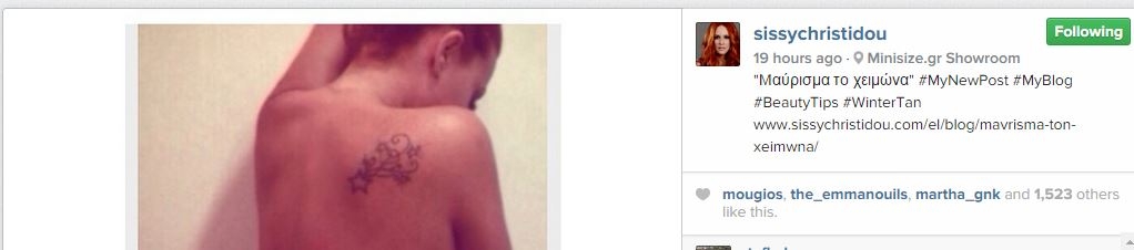 Η Σίσσυ Χρηστίδου πόζαρε στο φακό με γυμνή την πλάτη της. Η παρουσιάστρια μετά από δυο εγκυμοσύνες παραμένει όπως μπορείτε και εσείς να δείτε... σέξι! Η εν λόγω φωτογραφία να αναφέρουμε ότι είχε σαν στόχο να δείξει το μαύρισμα ακόμη και το χειμώνα με αφορμή ένα άρθρο της στο blog της! Πάντως, αν και έχουμε χειμώνα η Σίσσυ κατάφερε να ανεβάσει στα ύψη την θερμοκρασία, δεν συμφωνείτε;