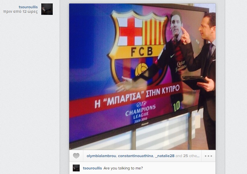 Ο Χρύσανθος Τσουρούλλης δεν σταματά στιγμή να κάνει πλάκα και το βράδυ της Δευτέρας πόσταρε μια χιουμοριστική φωτογραφία στην προσωπική του σελίδα στο instagram "πειράζοντας" τον διάσημο σταρ της Μπαρτσελόνα, Λιονέλ Μέσι που βρισκόταν σε φωτογραφία στη γιγαντοθόνη του δελτίου ειδήσεων του ΣΙΓΜΑ. Την φωτογραφία συνόδεψε με την λεζάντα "Are you talking to me" και έγινε χαμός απο τους διαδικτυακούς του φίλους που του άρχισαν κι αυτοί με την σειρά τους τα πειράγματα. Ο παρουσιαστής ευχήθηκε αργότερα και καλή επιτυχία στον ΑΠΟΕΛ που αντιμετωπίζει απόψε τους διάσημους σταρ της Μπαρτσελόνα στο ΓΣΠ!