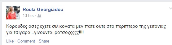 Με αφορμή τις χαμηλές θερμοκρασίες που υπάρχουν στο νησί μας πόσταρε το εξής σχόλιο στο διαδίκτυο προκαλώντας πολλά χιουμοριστικά σχόλια: "Κορούδες όσες έχετε σιλικονάτα μεν πάτε ούτε στο περίπτερο της γειτονιάς για τσιγάρα... γίνουνται ρότσοςςςςς!!!!".