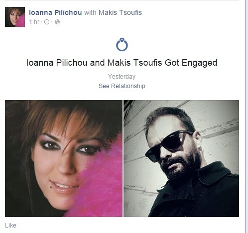 Είναι τρελά ερωτευμένη κι ευτυχισμένη και φυσικά όχι μόνο δεν το κρύβει αλλά πριν από λίγη ώρα ανακοίνωσε και τον αρραβώνα της μέσω facebook! Ο λόγος για την Ιωάννα Πηλιχού και τον εδώ και ενάμιση χρόνο αγαπημένο της Μάκη Τσούφη ο οποιίος ασχολείται με τη σκηνοθεσία και το μοντάζ και είναι για την Ιωάννα το άλλο της μισό, Η γνωστή ηθοποιός βρήκε στο πρόσωπό του τον άνθρωπο που την ολοκλήρωσε και λάμπει στην κυριολεξία από ευτυχία. Την χαρούμενη ανακοίνωση του αρραβώνα τους στο Facebook ακολούθησε καταιγισμός ευχών για το ζευγάρι από φίλους και θαυμαστές της Ιωάννας. Συγχαρητήρια!