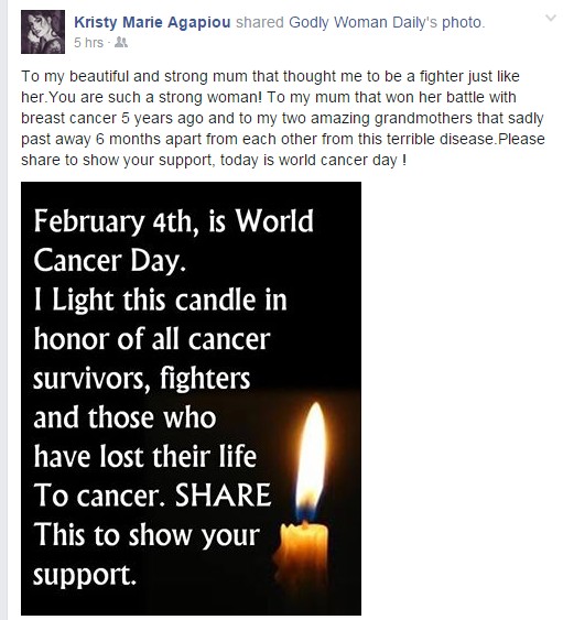 Με ένα όμορφο κείμενο για αγαπημένα της πρόσωπα και μία φωτογραφία με ένα σημαντικό μήνυμα για την ασθένεια που πλήττει τον πλανήτη, η πανέμορφη Κρίστη Αγαπίου θέλησε να αποτίσει φόρο τιμής σε όλους όσοι αγωνίστηκαν και νίκησαν αυτή την αρρώστια. Συγκεκριμένα η ίδια έγραψε: " Στην πανέμορφη και δυνατή μητέρα μου που με έμαθε να είμαι αγωνίστρια όπως εκείνη. Είσαι μία πολύ δυνατή γυναίκα. Στη μητέρα μου που νίκησε τη μάχη με τον καρκίνο του μαστού πριν από πέντε χρόνια και στις δύο υπέροχες γιαγιάδες μου που δυστυχώς "έφυγαν" από τη ζωή με έξι μήνες διαφορά από αυτή την ασθένεια. Σας παρακαλώ κοινοποιήστε (την πιο κάτω φωτογραφία) για να δείξετε τη στήριξή σας, σήμερα που είναι η παγκόσμια ημέρα κατά του καρκίνου".