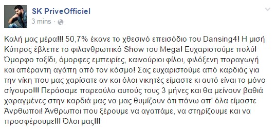 Παρά το ότι κοιμήθηκε τα ξημερώματα μετά τη μεγάλη νίκη του στο "DanSing For You" ο Σταύρος Κωνσταντίνου ξύπνησε νωρίς το πρωί της Δευτέρας και έστειλε το δικό του διαδικτυακό μήνυμα σε όλους μαζί με ένα τεράστιο ευχαριστώ για τις χιλιάδες ψήφους που του χάρισαν μαζί με την Τζώρτζια Παναγή το βραβείο του νικητή στο τραγούδι του Dansing for you. Διαβάστε τι έγραψε: