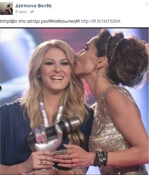 Μάλιστα, η Δέσποινα Βανδή, η οποία είδε τον ελληνικό τελικό έστειλε τα συγχαρητήριά της, ανεβάζοντας μία κοινή τους φωτογραφία από τον τελικό του "The Voice", γράφοντας "μπράβο αστέρι μου! Καθηλωτική!!!".