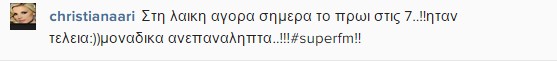 Λατρεύει τη νέα επαγγελματική της πρόκληση την καθημερινή πρωινή πλέον ραδιοφωνική εκπομπή, 6-10, με τον Κωνσταντίνο Τσιολή στον Super Fm. Η αγαπημένη παρουσιάστρια πρωί-πρωί της Τετάρτης εγκατέλειψε τον ραδιοφωνικό της παρτενέρ γύρω στις 7 και πετάχτηκε στη λαική και αγόρασε τρόφιμα και φρούτα. Λίγη ώρα αργότερα μπήκε στο στούντιο με τα ψώνια και έβγαλε πολλές αναμνηστικές φωτογραφίες με τον Κωνσταντίνο Τσιολή ενώ μοιράστηκε μαζί με τους ακροατές την εμπειρία της.