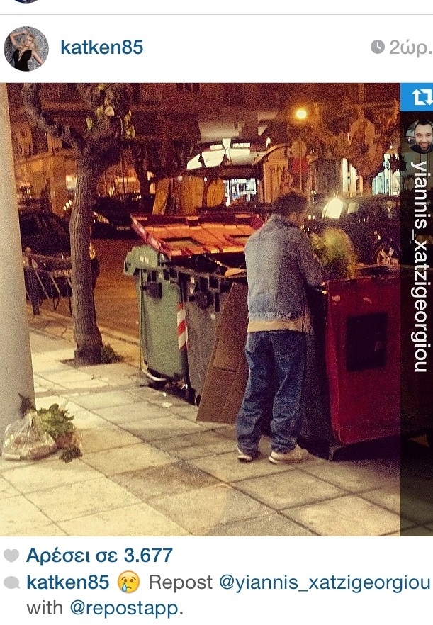 Χθες βράδυ, η παρουσιάστρια αποφάσισε να κάνει repost την φωτογραφία ενός διαδικτυακού της φίλου. Η φωτογραφία αυτή, έδειχνε έναν νέο άντρα να ψάχνει στους κάδους σκουπιδιών να βρει φαγητό. Εκείνος που την ανέβασε στο instagram εξηγούσε από κάτω που είδε αυτό τον άντρα και την αντίδρασή του.