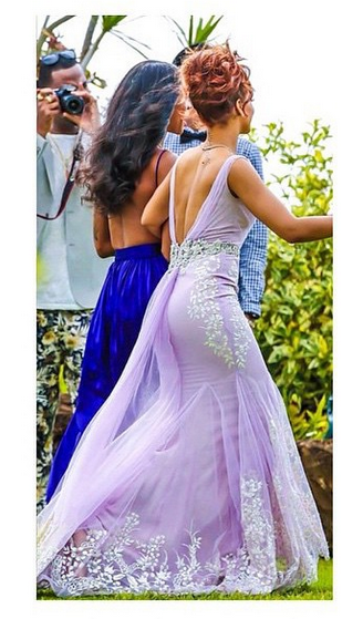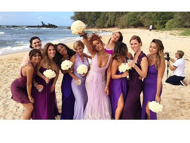 Μάλιστα η Rihanna, ντύθηκε παράνυμφος για το γάμο της φίλης της, εντυπωσιάζοντας μέσα στο βιολετί, maxi φόρεμα.
