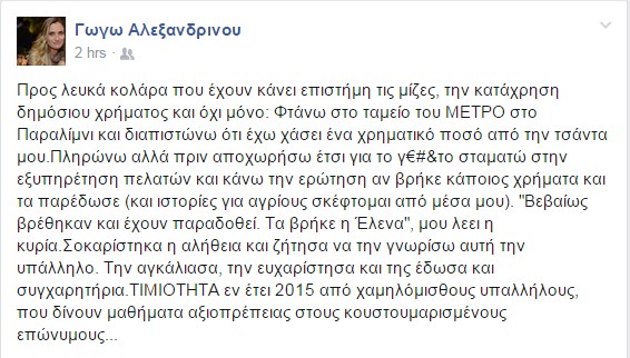 Σε υπεραγορά στο Παραλίμνι βρέθηκε σήμερα η παρουσιάστρια του ΣΙΓΜΑ, "Ανοιχτή Γραμμή" Γωγώ Αλεξανδρινού και περιέγραψε αυτό που έζησε με ένα post στο facebbok μιλώντας με αιχμηρά λόγια για τα "λευκά κολλάρα" και με συγκινητικά για μία χαμηλόμισθη υπάλληλο. Διαβάστε πως περιγράφει η ίδια αυτό που έζησε