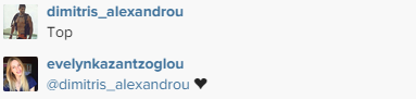 Ο Δημήτρης Αλεξάνδρου, αρκετά συχνά σχολιάζει στις φωτογραφίες που αναρτά η σύντροφός του στο προσωπικό της λογαριασμό στο Instagram. Στην πρόσφατη φωτογραφία που ανέβασε το μοντέλο, εκείνος της εξέφρασε τον θαυμασμό του ενώ εκείνη αρκέστηκε να του απαντήσει με μία καρδιά.