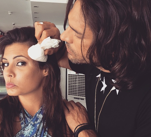 Στην φωτογραφία που η ίδια ανέβασε στον προσωπικό της λογαριασμό στο Instagram, φαίνεται ότι το έτερον της ήμισυ στην μικρή οθόνη, την περιποιείται. "Σκηνή με καβγά ανάμεσα Φίλιππου (Σπαλιάρα) και Αντρέα (Καζάκου) και εγώ την έφαγα κανονικότατα από την υπέροχη και καθόλου ψεύτικη μπουνιά του Σπαλιάρα (κατά λάθος) ... Νομίζω ότι είμαι καλά! Αλλιώς να ξέρετε ότι σας αγάπησα!", έγραψε χαρακτηριστικά.