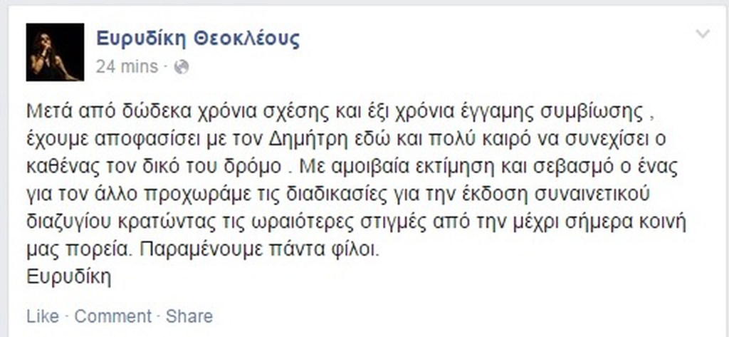 Και η ίδια μέσα από την προσωπική της σελίδα στο facebook επιβεβαίωσε το γεγονός του χωρισμού γράφοντας τα ακόλουθα: "Μετά από δώδεκα χρόνια σχέσης και έξι χρόνια έγγαμης συμβίωσης , έχουμε αποφασίσει με τον Δημήτρη εδώ και πολύ καιρό να συνεχίσει ο καθένας τον δικό του δρόμο . Με αμοιβαία εκτίμηση και σεβασμό ο ένας για τον άλλο προχωράμε τις διαδικασίες για την έκδοση συναινετικού διαζυγίου κρατώντας τις ωραιότερες στιγμές από την μέχρι σήμερα κοινή μας πορεία. Παραμένουμε πάντα φίλοι.